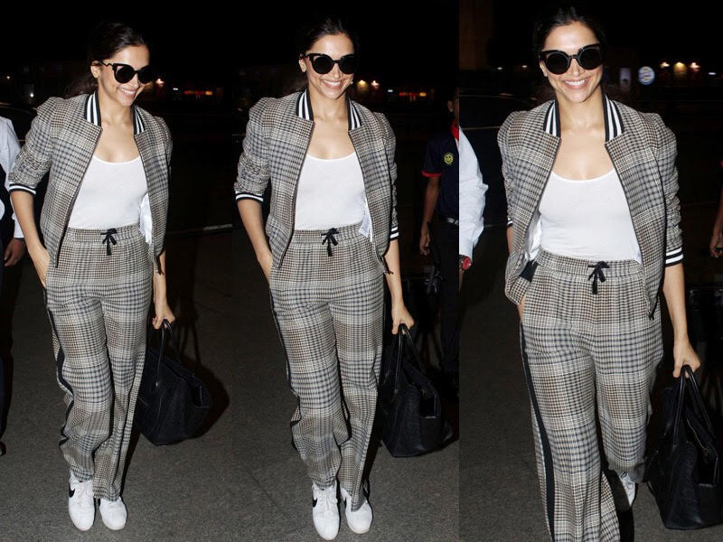 3.Carrying checkered patterns is a risky affair. Deepika sported a set of white fit tee, checkered bomber jacket and loose checkered trousers and definitely gave off poised vibes.