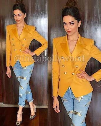7.Structured in style, Deepika Padukone makes minimal look lively in her mustard yellow jacket. Matched with ankle-length denim jeans and heels, it’s an attractive option for work wear too.