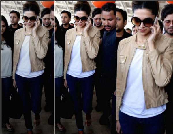2.Sporty yet laid back, this beige jacket on Deepika suited her entire attire too well. A white tee and denim jeans with the poised jacket definitely took the fashion a meter up.