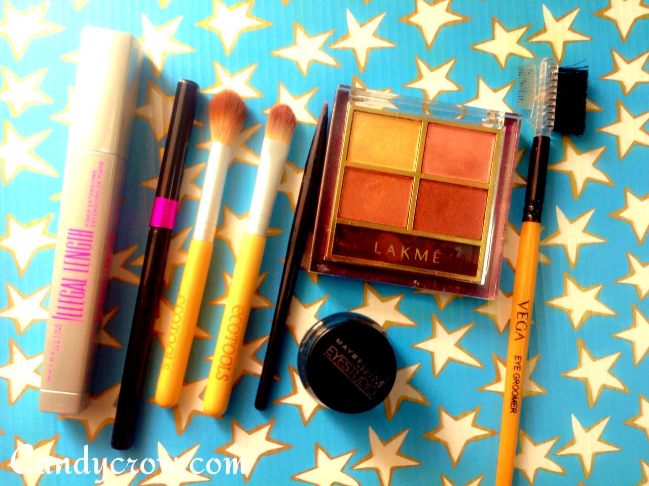 Maybelline gel eyeliner, maybelline illegal length mascara, colosal kajal, and Lakme eye shadow quartet desert rose
