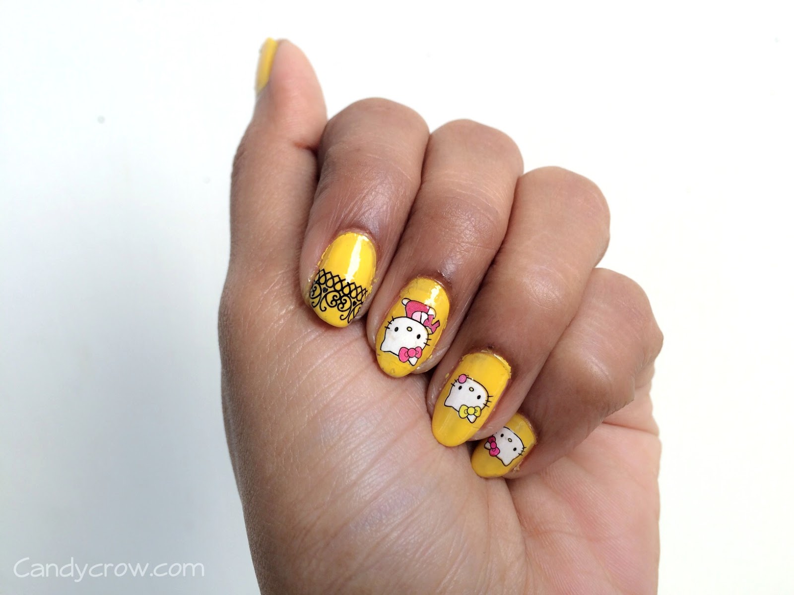 For the base color, I have used Maybelline sweet sunshine, and the top coat is from OPI. The lace and hello kitty is from different sheets of water decals. If you are wondering, How to use a water decal you can find the details HERE.