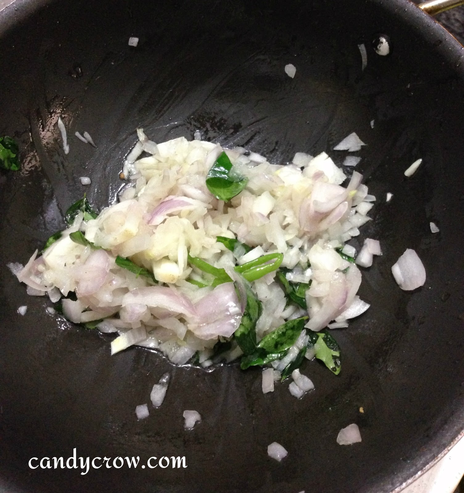 3. Heat 2 tbsp of oil in another pan, add green chilli allow it to sputter. Then add curry leaves and saute for a couple of minute. (close the pan with a lid after adding chilli it as it sputters a lot)